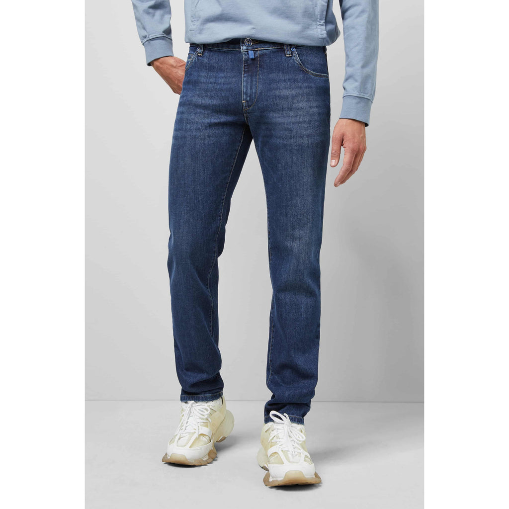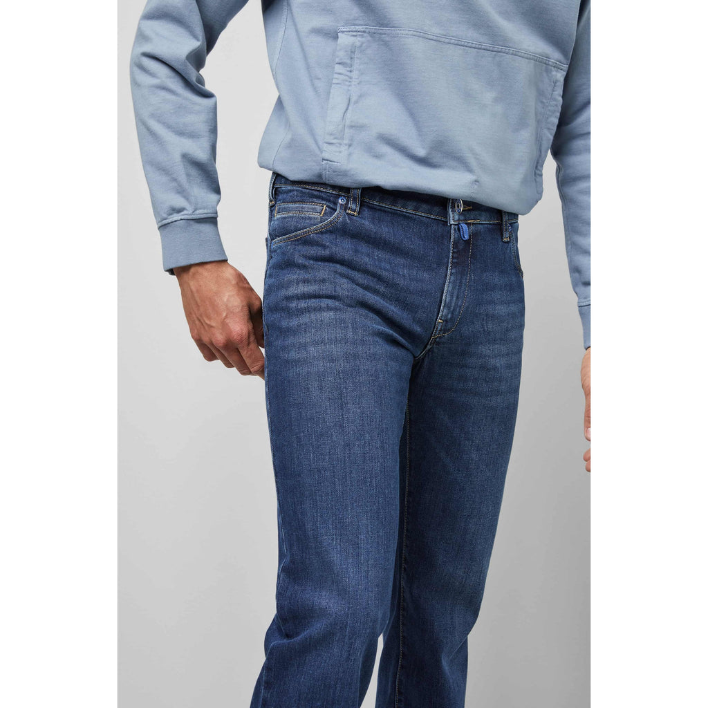 The modern super stretch denim with its exceptional recovery features as well as our special round waistband finishing with an additional belt loop ensures unique high wearing comfort.